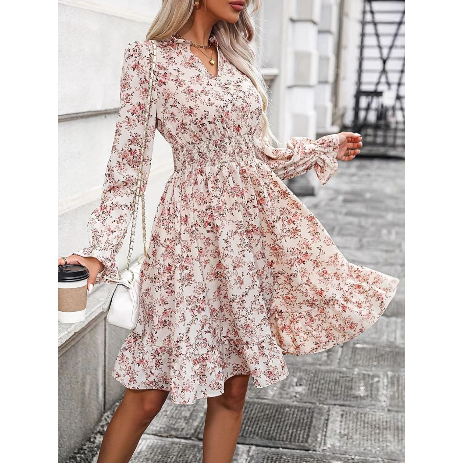 Ruffle Hem Floral Surplice Long Sleeve Dress