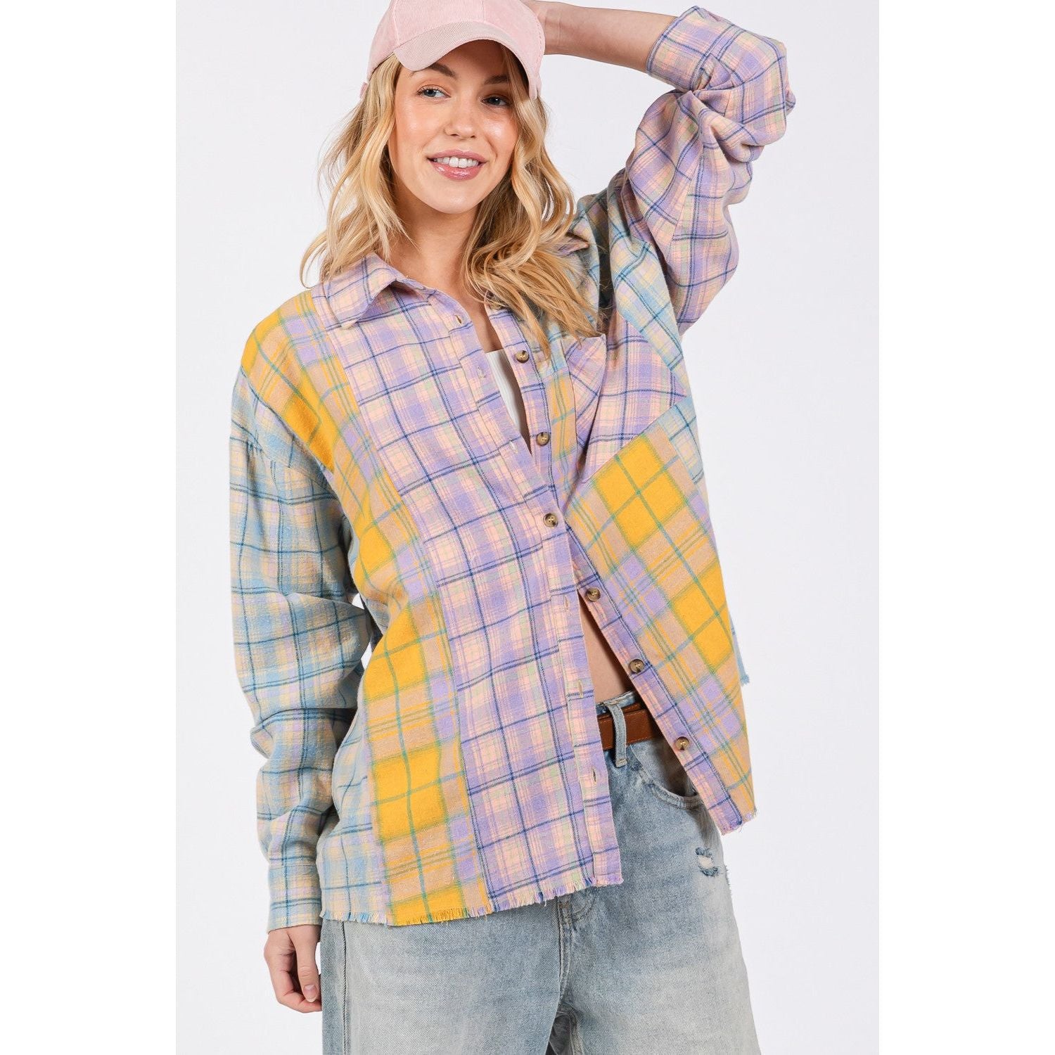 The Long Sleeves Mix Match Plaid Flannel Shirt is a cozy and stylish addition to your wardrobe. Made from super soft fabric, this shirt offers comfort and warmth throughout the day. The collared neckline and dropped shoulders add a touch of casual sophistication to the design. Featuring an uneven and raw bottom hem, this shirt exudes a trendy and edgy look. The loose and relaxed fit provides a comfortable and laid-back vibe. Embrace a cool and effortless style with this versatile plaid flannel shirt in your collection.