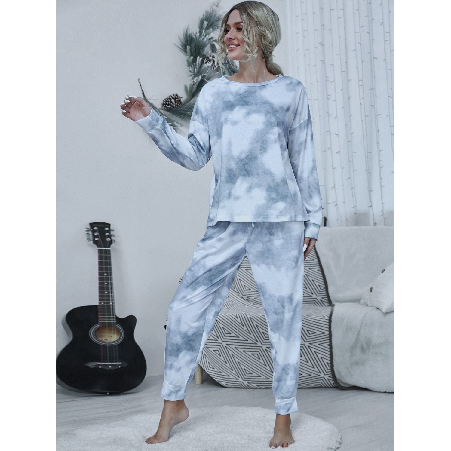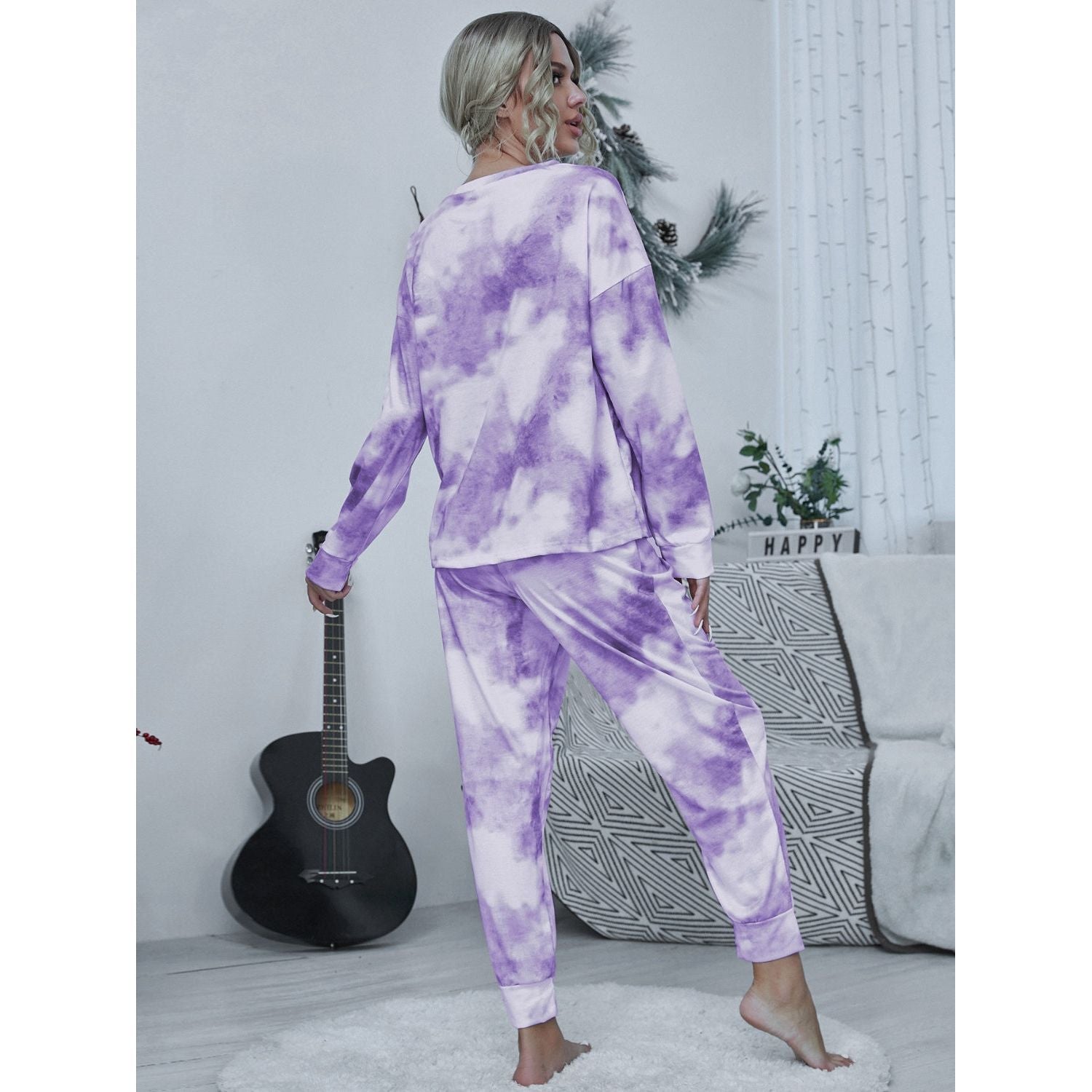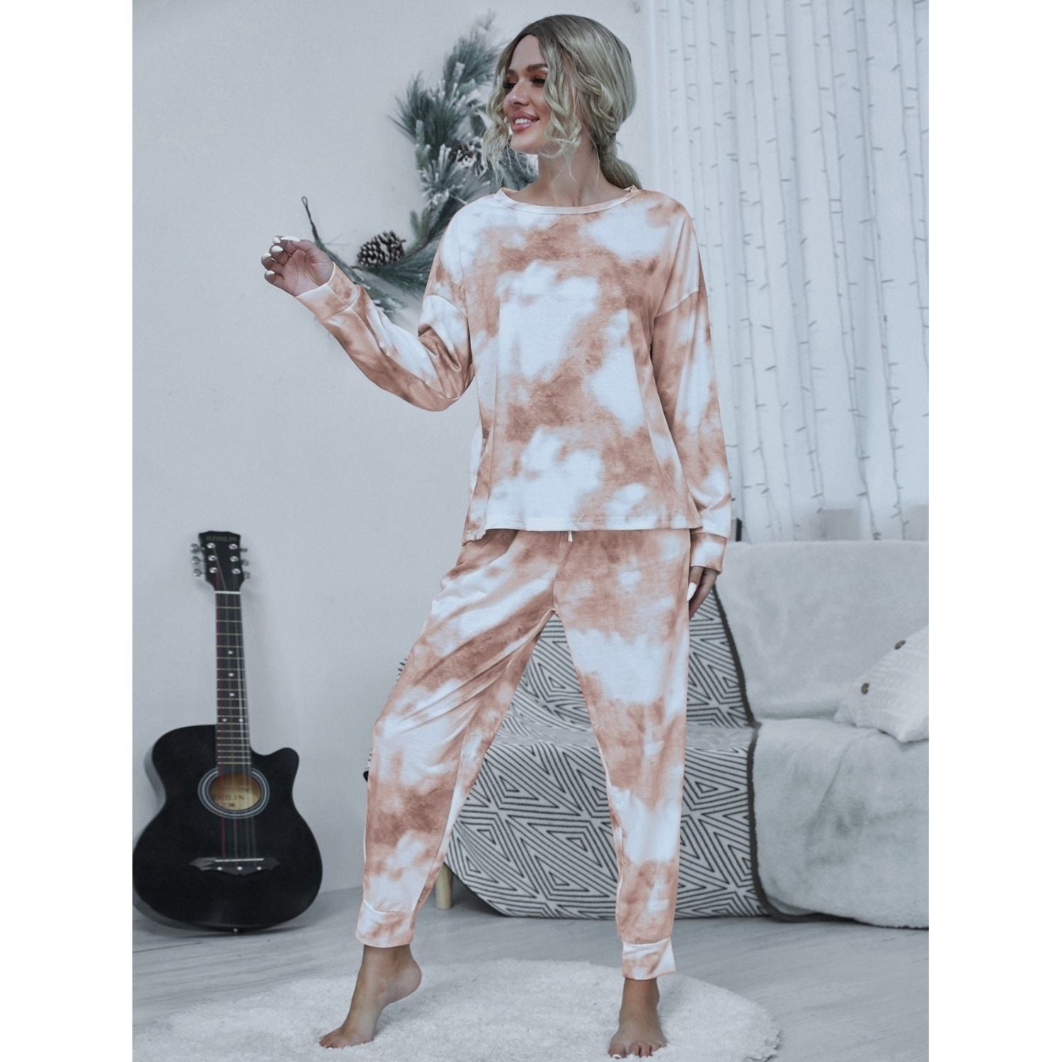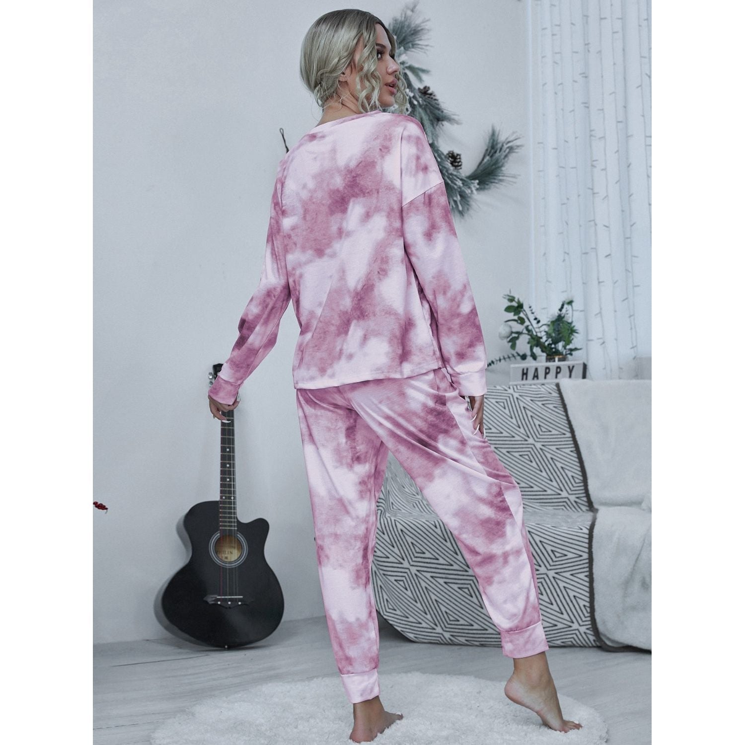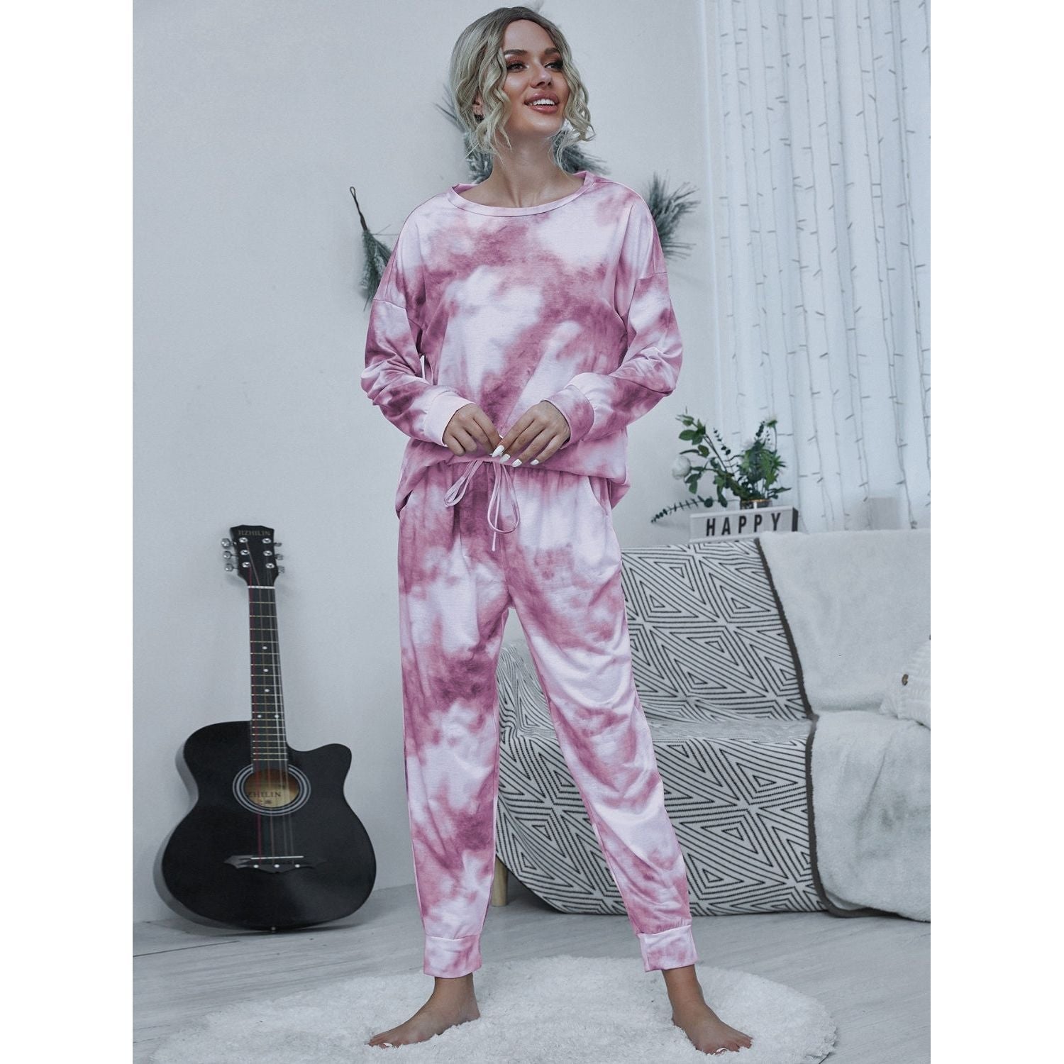 Shiny Tie-dye Round Neck Top and Drawstring Pants Lounge Set