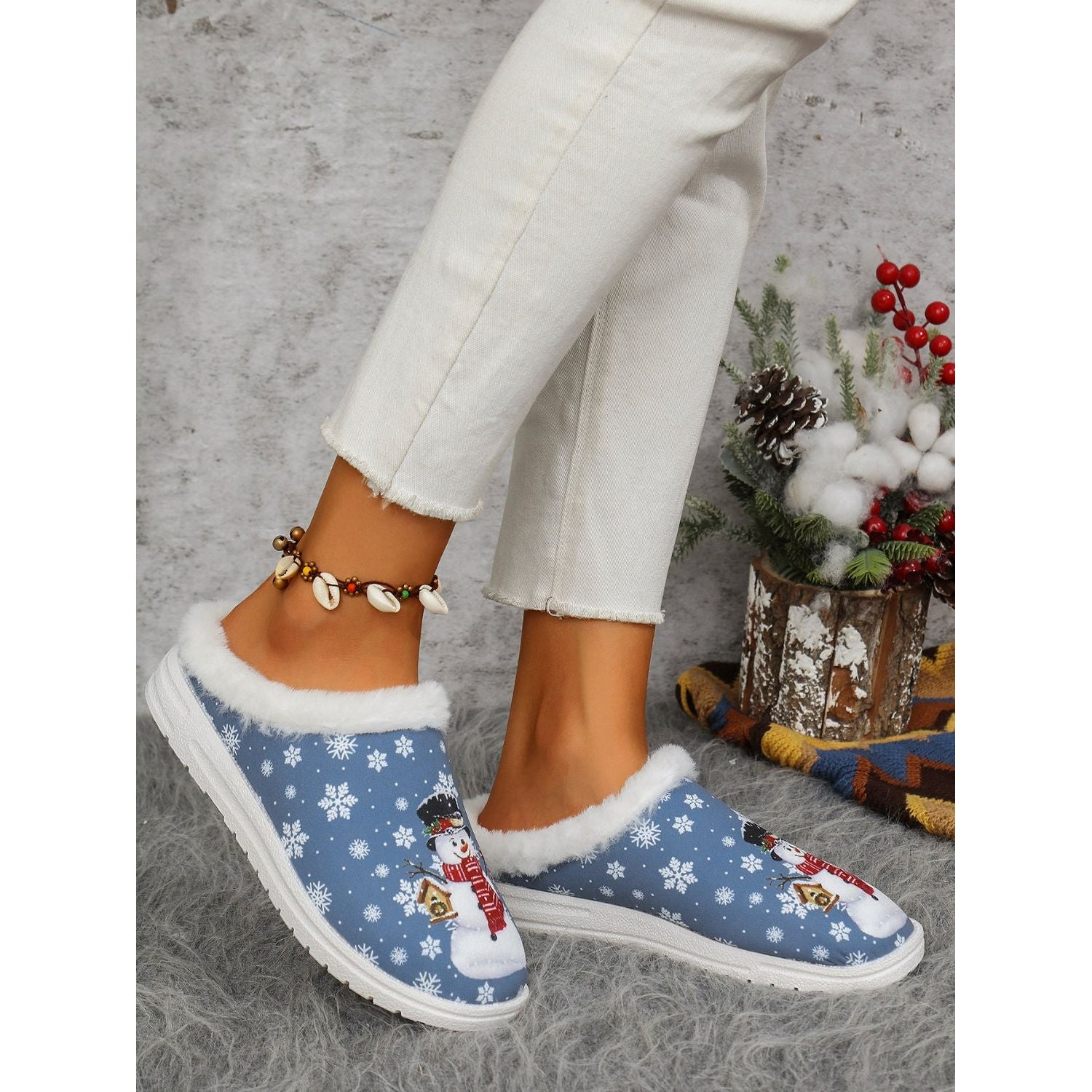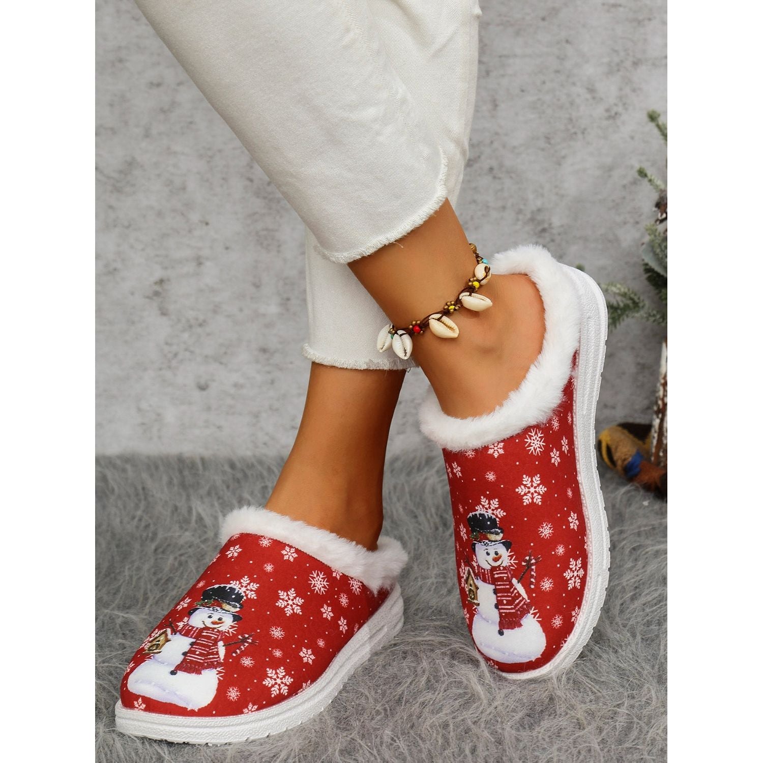 Snowman Print Flat Slippers with Faux Fur