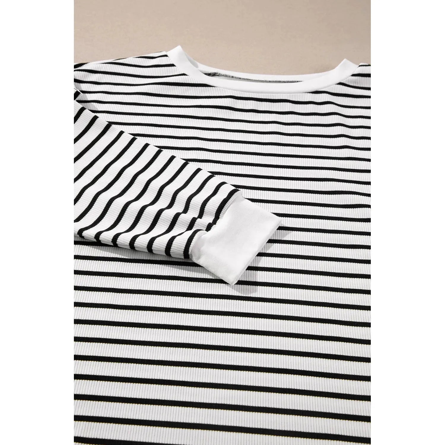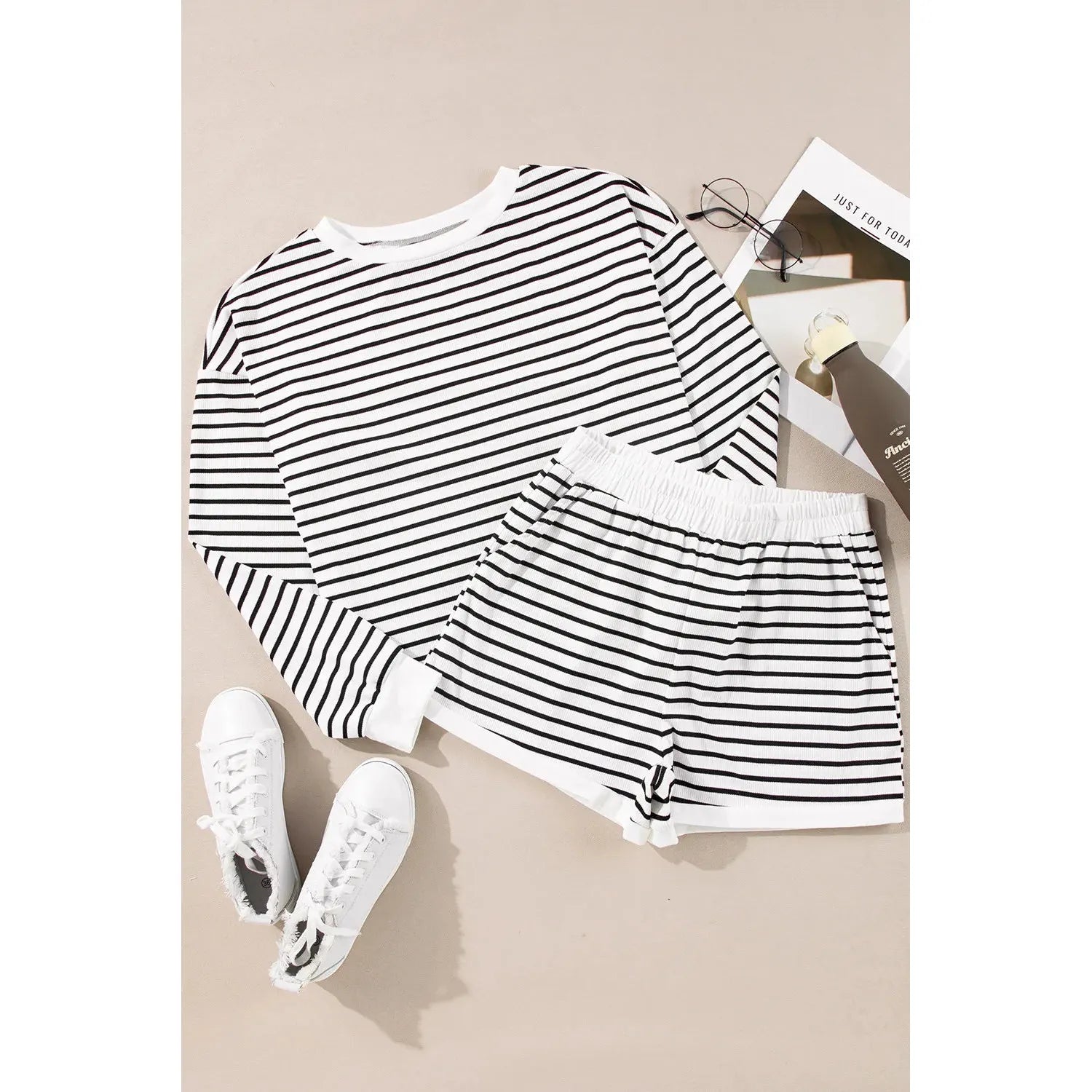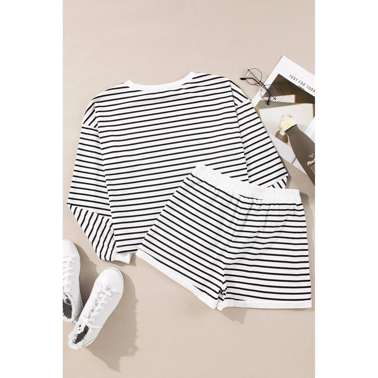 Striped Round Neck Long Sleeve Top and Shorts Set