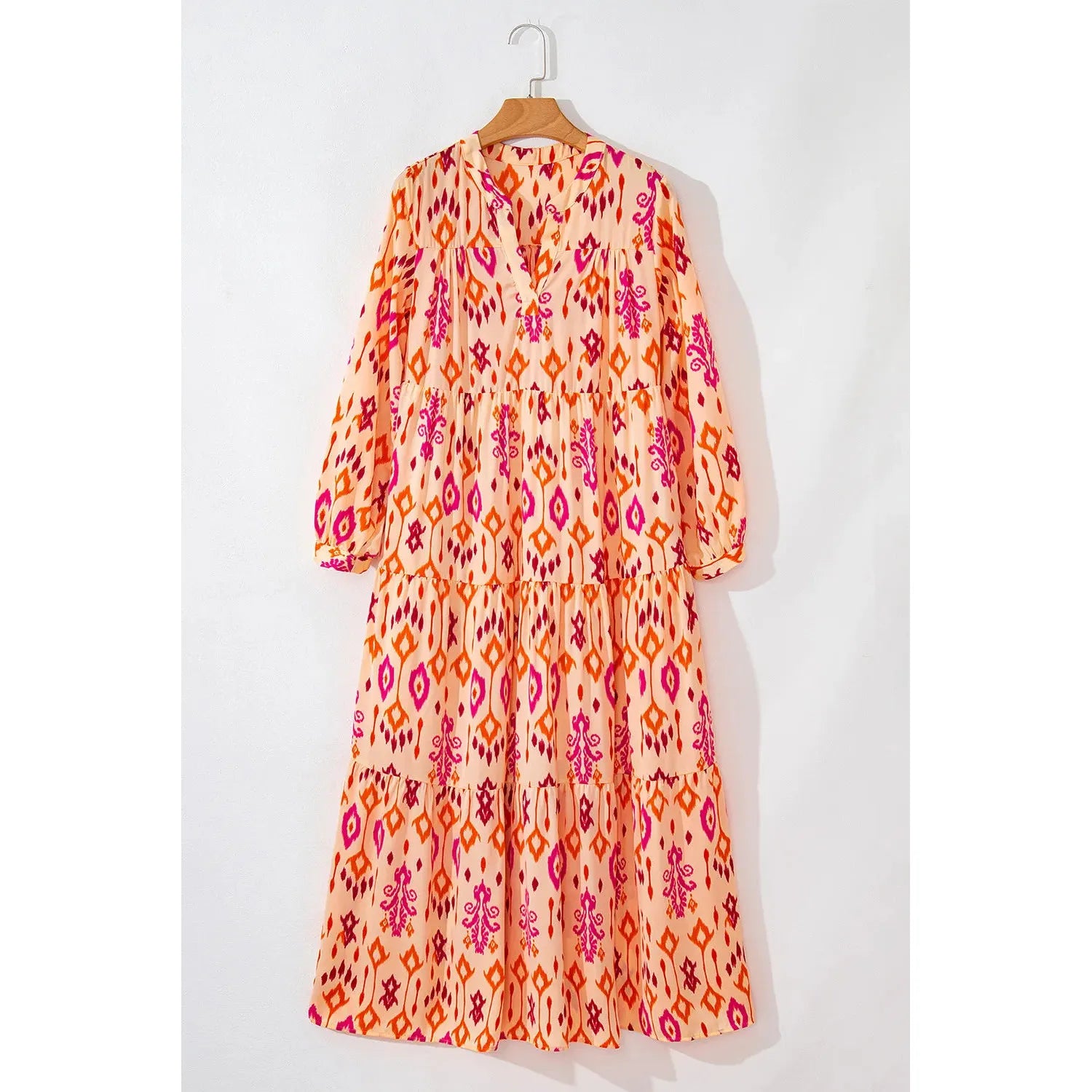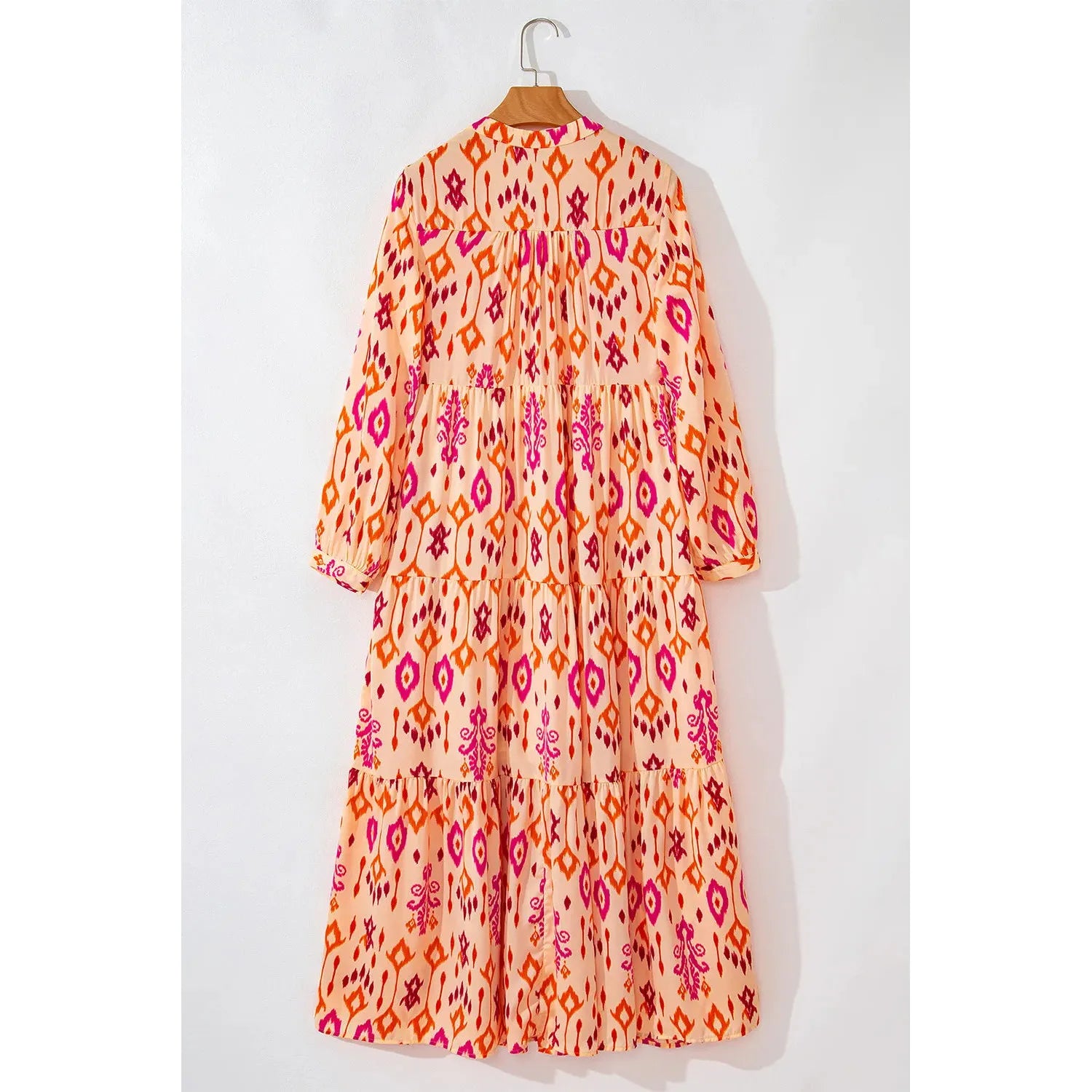 Tiered Printed Notched Long Sleeve Midi Dress