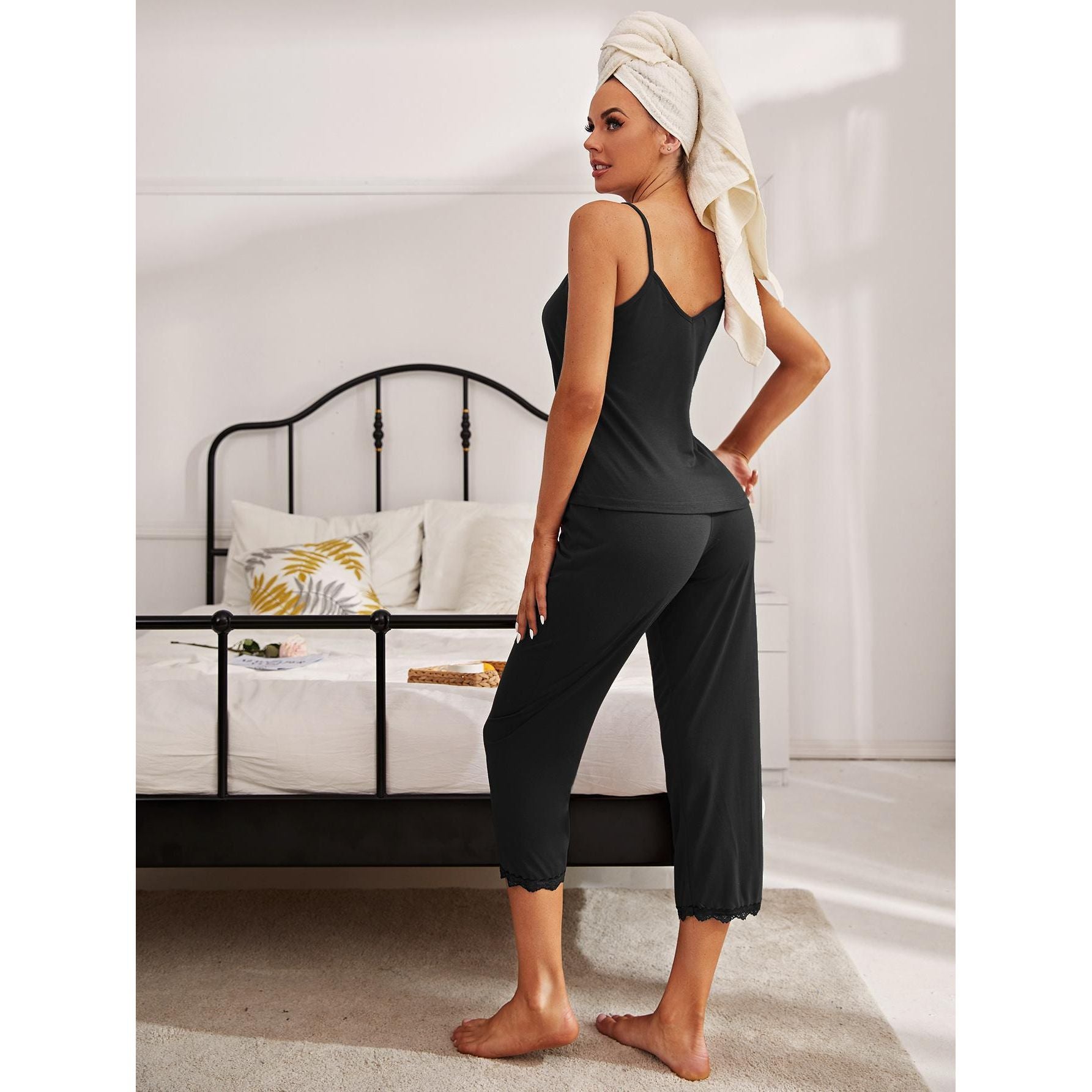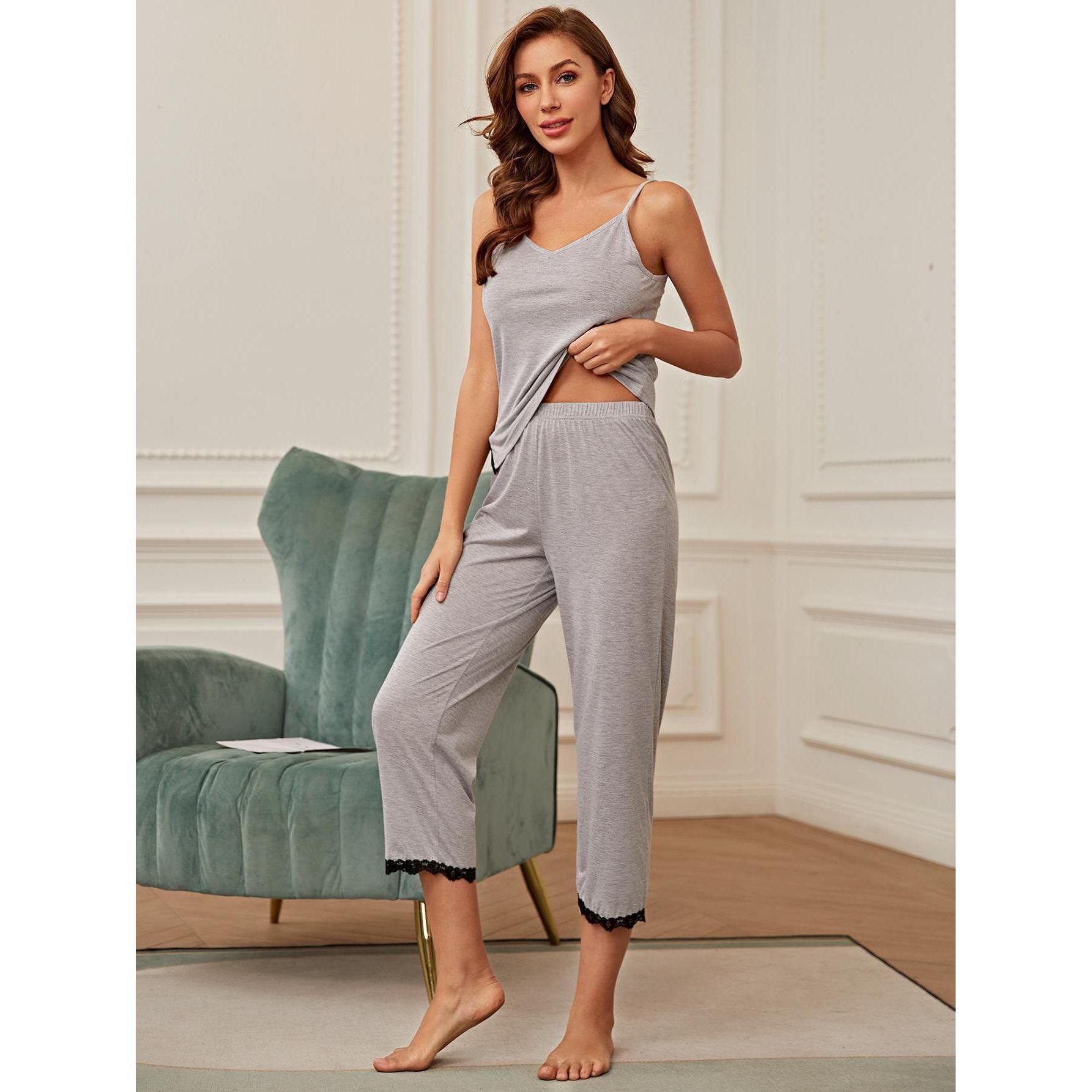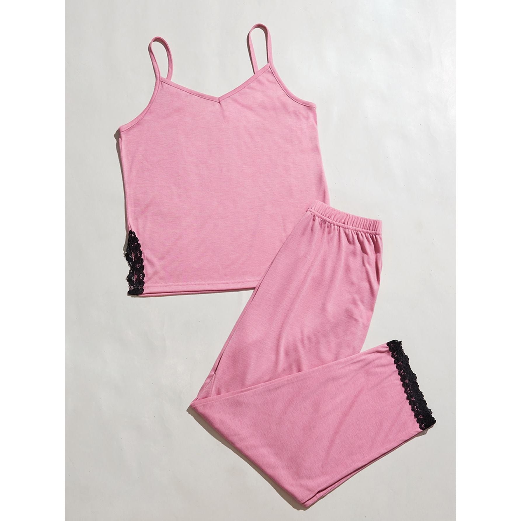 V-Neck Lace Trim Slit Cami and Pants Pajama Set