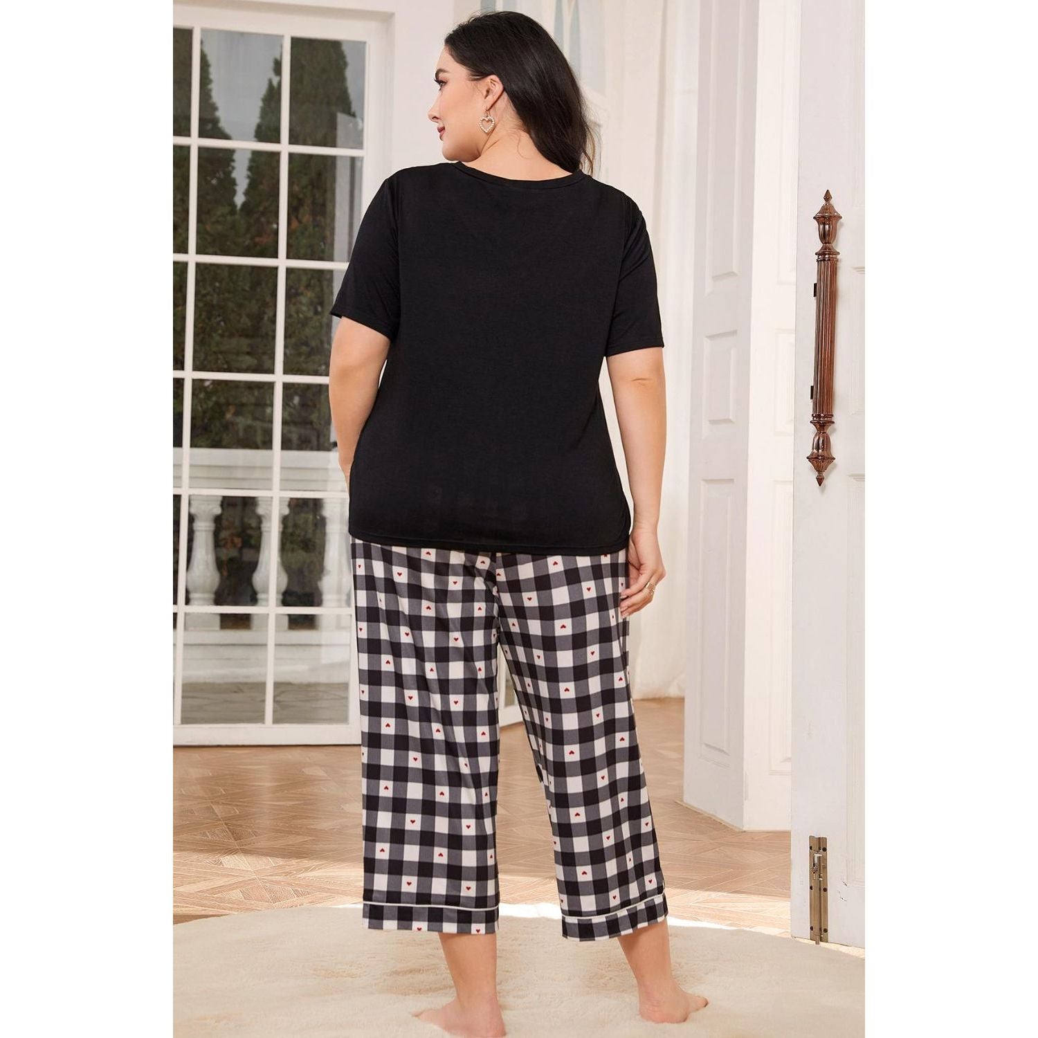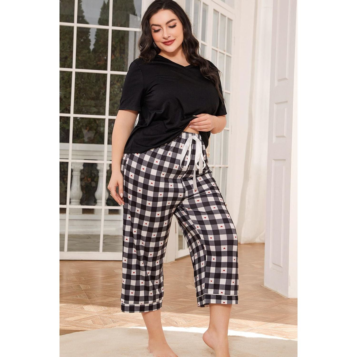 V-Neck Tee and Plaid Cropped Pants Lounge Set