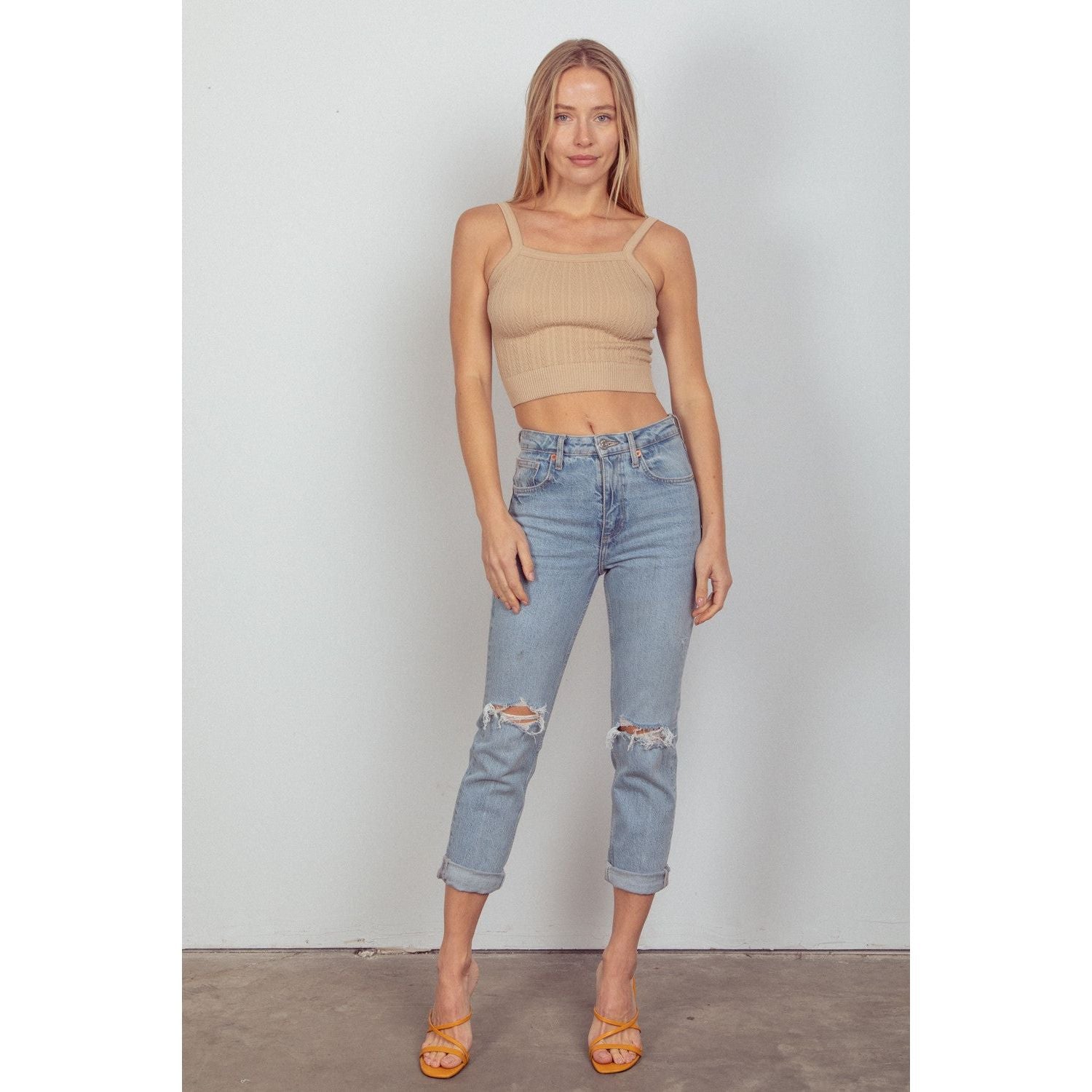 The Cable Knit Seamless Cropped Cami combines comfort with style for a chic and cozy look. This cami features a cable knit design that adds texture and detail to any outfit. The seamless construction ensures a smooth and flattering fit, perfect for layering or wearing on its own. The cropped length adds a trendy touch, making it ideal for pairing with high-waisted bottoms. Whether styled with jeans for a casual day out or dressed up with a skirt for a night out, this cami is versatile and fashionable. Elevate your wardrobe with the Cable Knit Seamless Cropped Cami for a trendy and effortless ensemble.