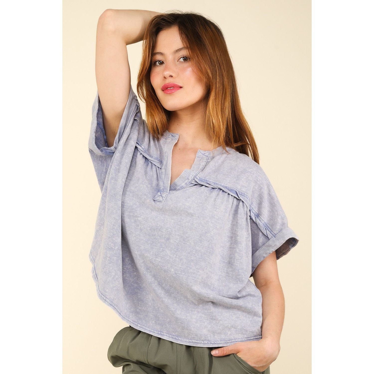 The Notched Washed Knit Top features a stylish washed knit fabric for a laid-back yet trendy look. The short folded sleeves add a casual touch to the top, perfect for everyday wear. With its easy style and casual fit, this top is a versatile wardrobe staple that can be paired with jeans, shorts, or skirts for a comfortable and effortless outfit.