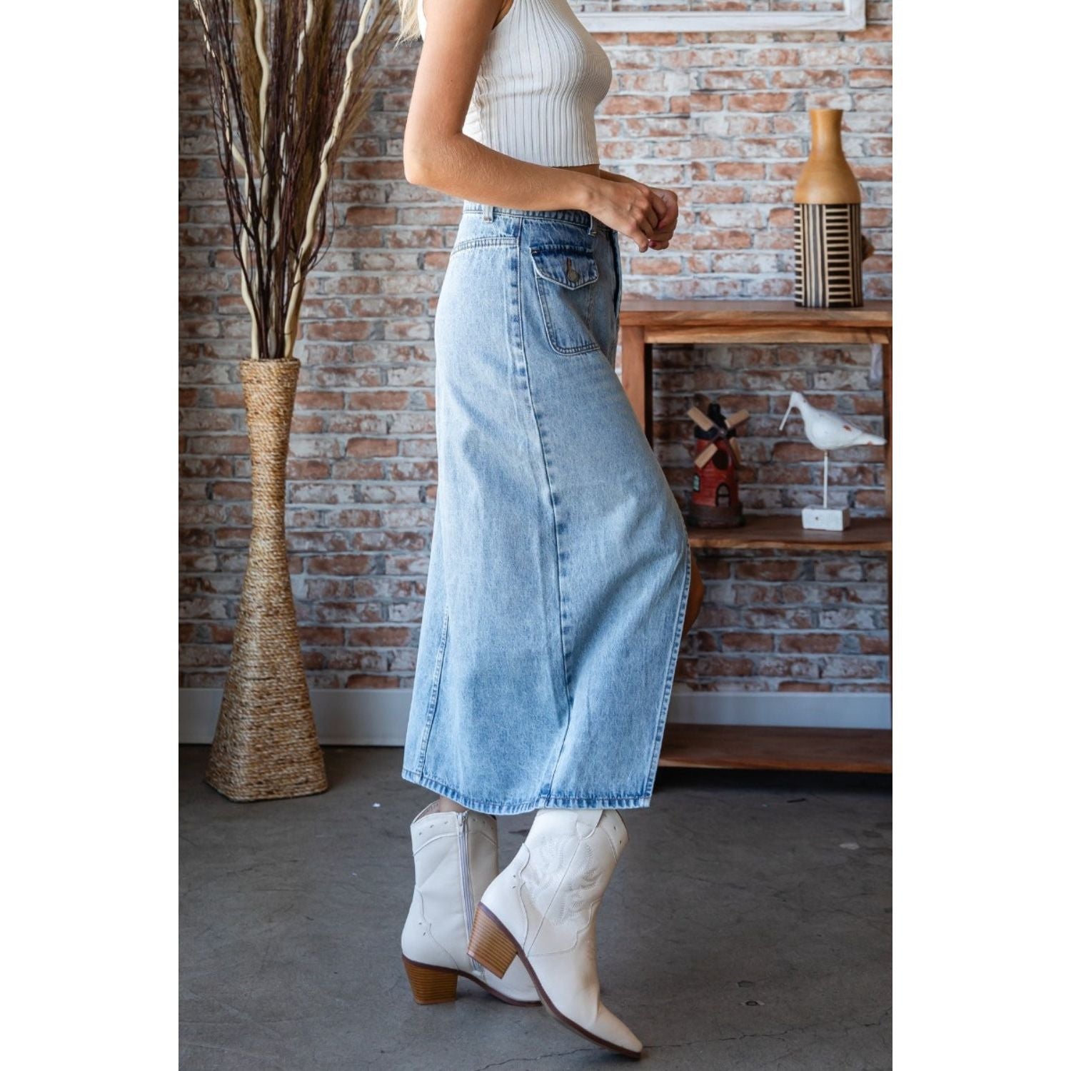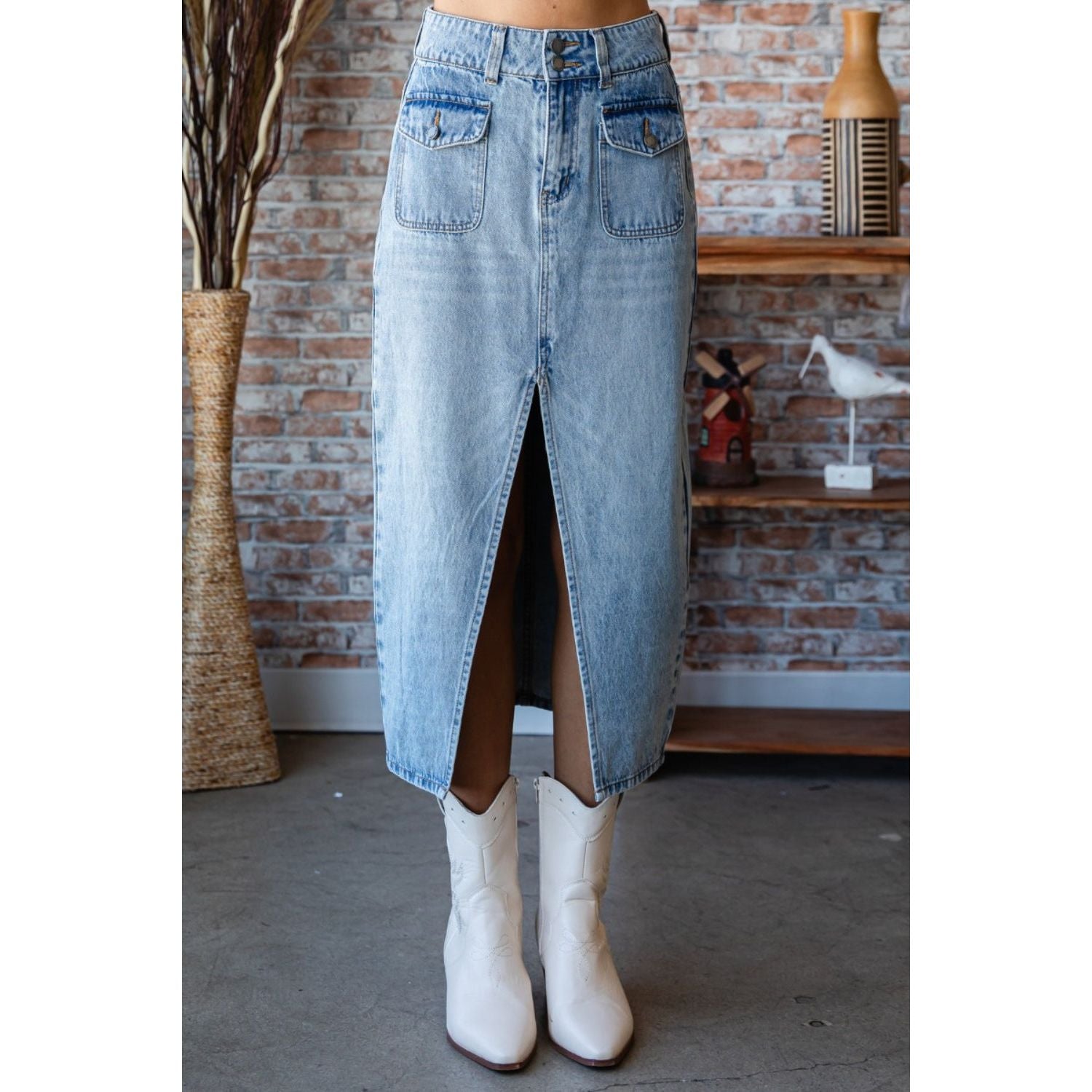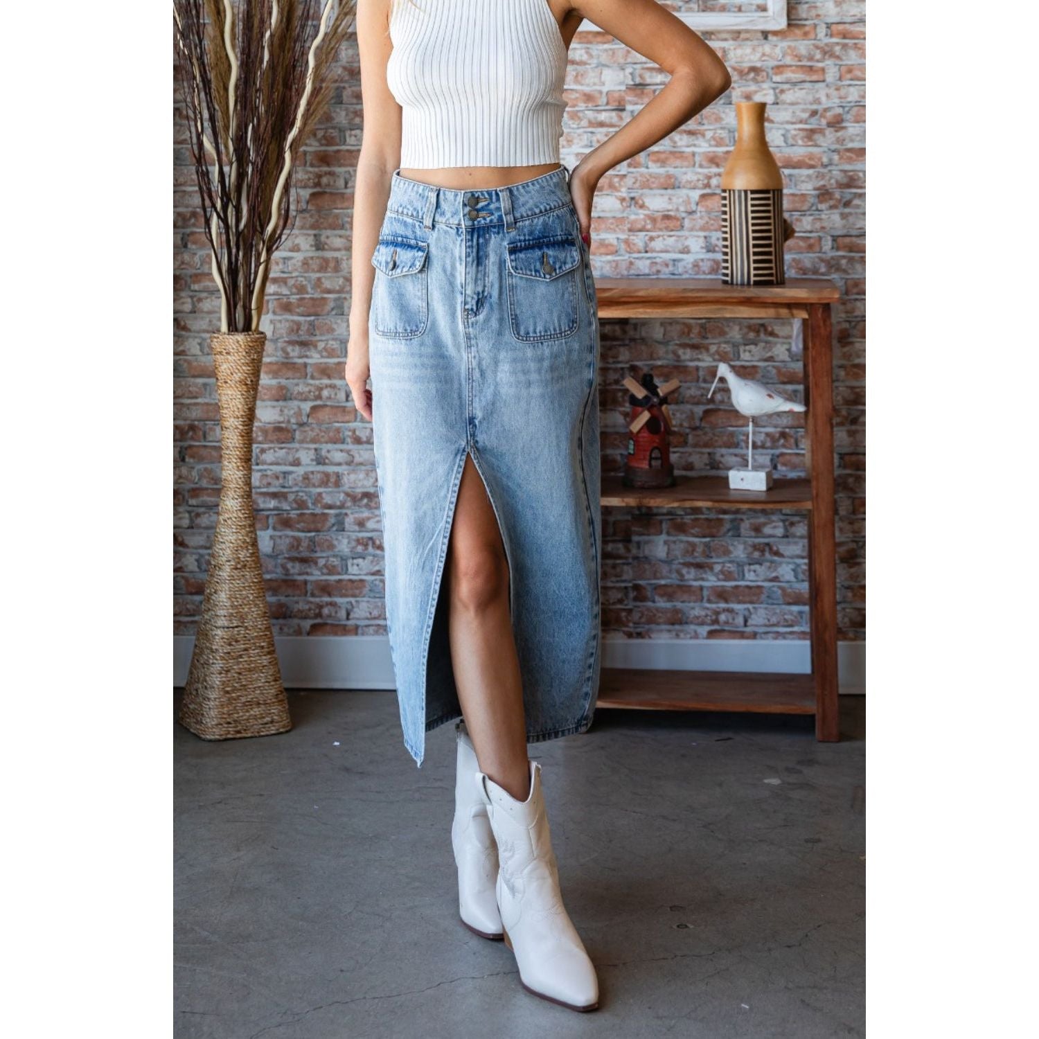 This slit mid-rise waist denim skirt is a chic and fashionable choice for any wardrobe. The slit detail adds a flirty and playful touch, while the mid-rise waist offers a flattering fit. The denim fabric gives it a classic and timeless look, making it easy to dress up or down for any occasion. Pair it with a tucked-in blouse and heels for a sophisticated and stylish ensemble.