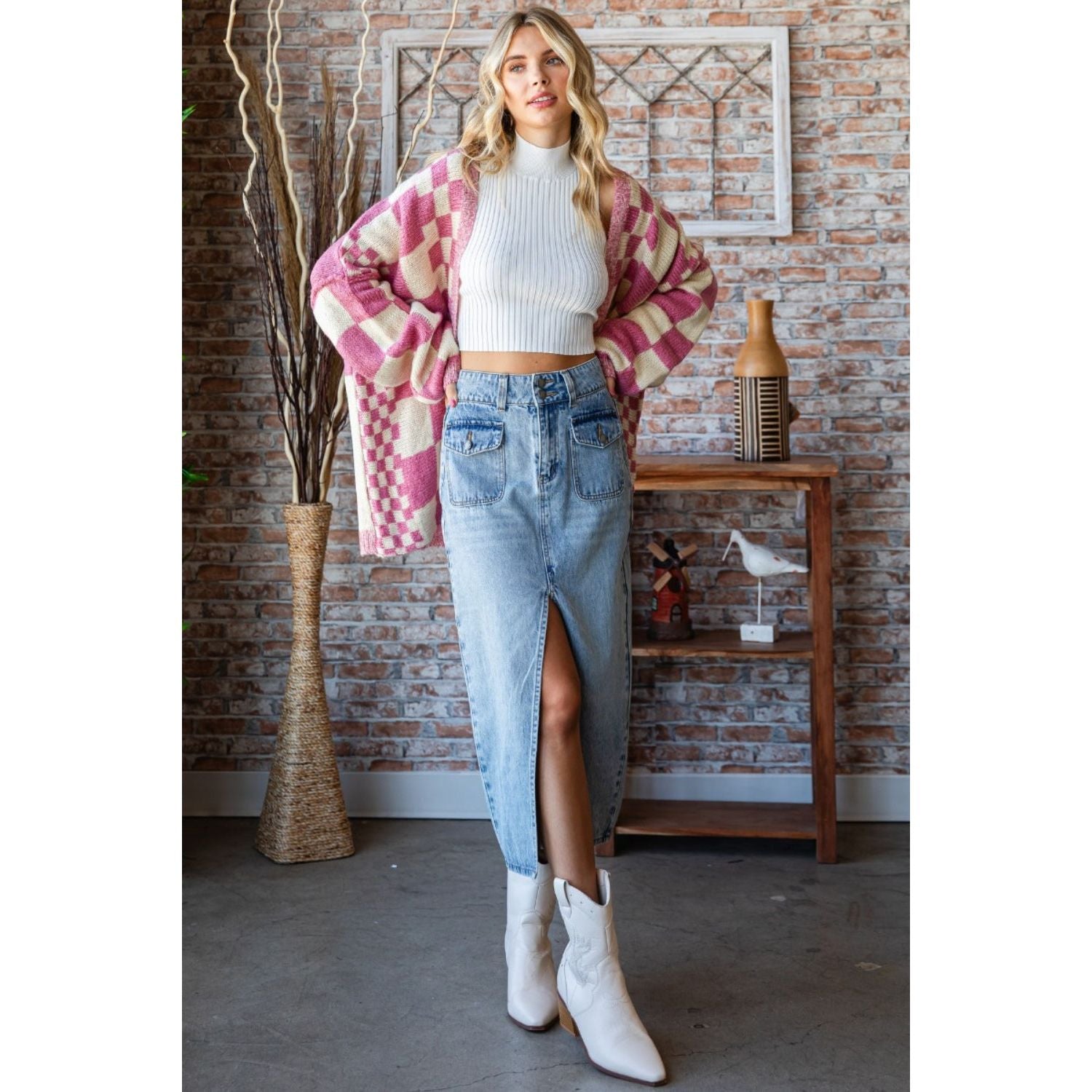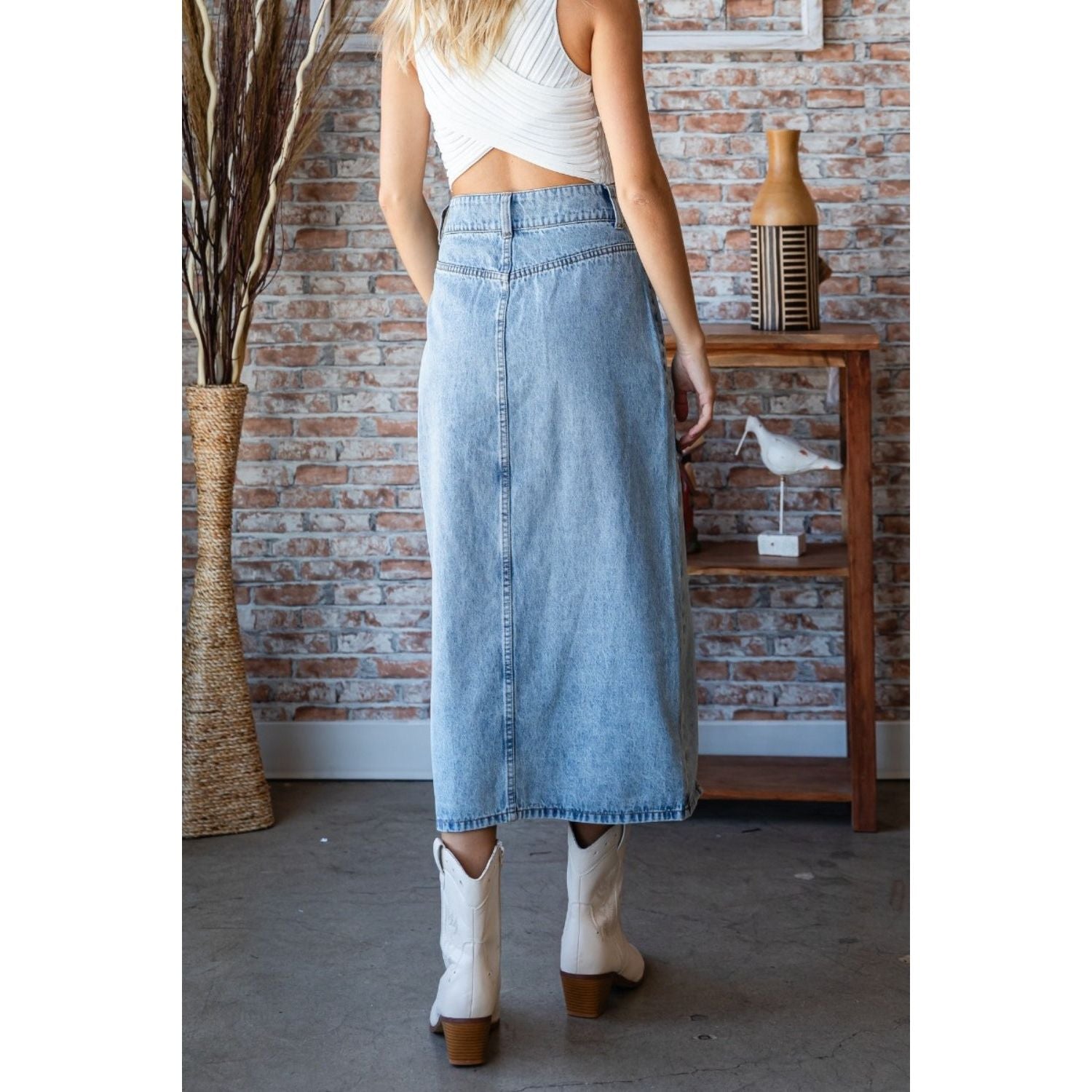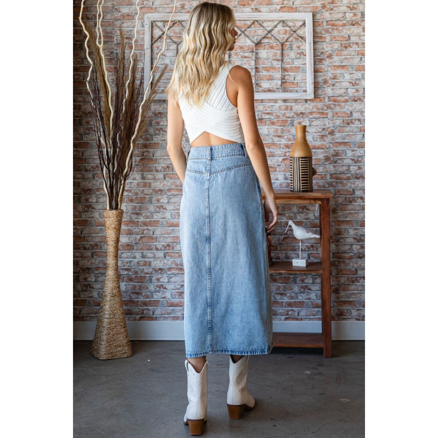This slit mid-rise waist denim skirt is a chic and fashionable choice for any wardrobe. The slit detail adds a flirty and playful touch, while the mid-rise waist offers a flattering fit. The denim fabric gives it a classic and timeless look, making it easy to dress up or down for any occasion. Pair it with a tucked-in blouse and heels for a sophisticated and stylish ensemble.