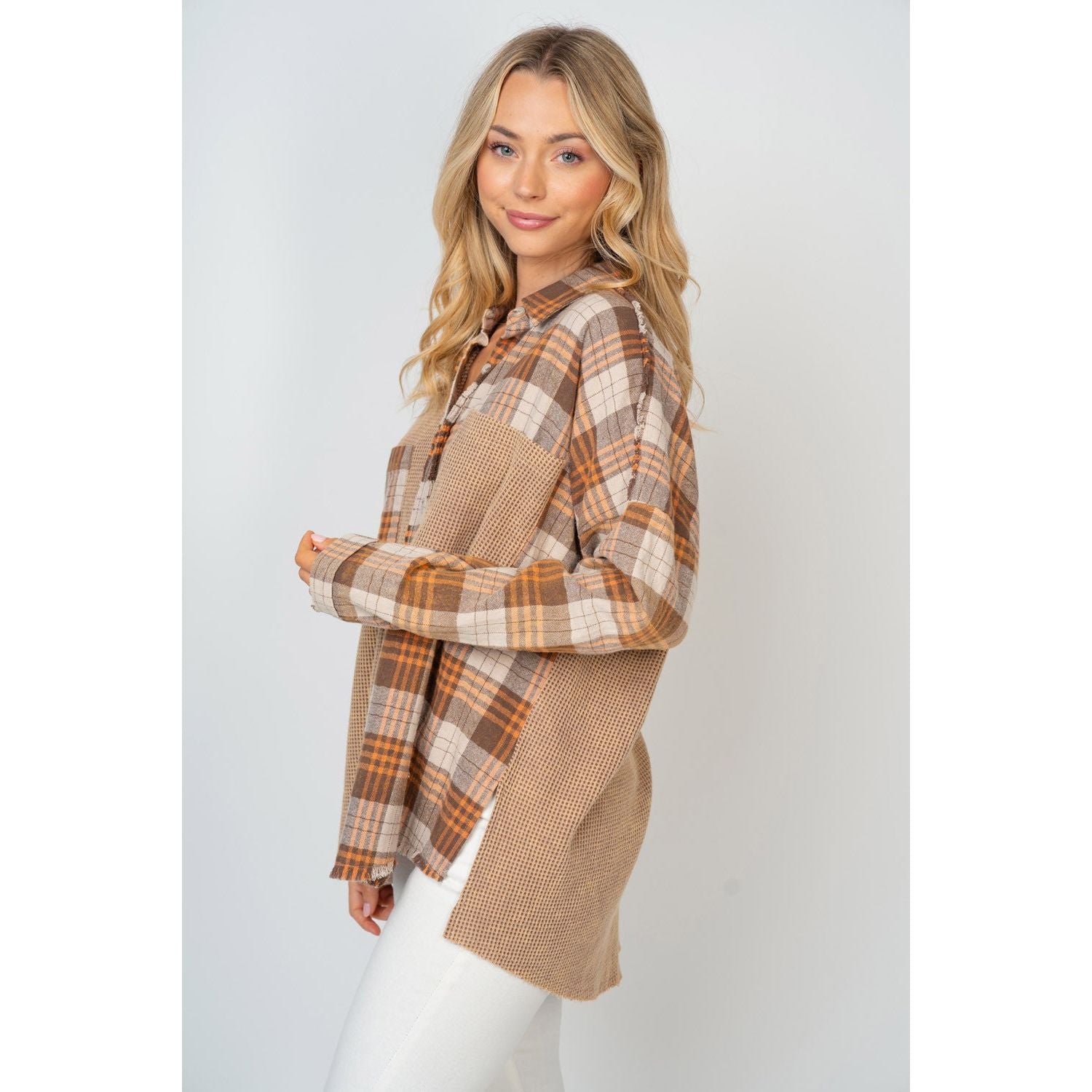 A Contrast Plaid Button Down Shirt is a versatile and stylish piece that features a classic plaid pattern with contrasting details. This type of shirt typically includes different colors or patterns within the plaid design to create a visually interesting and modern look. The button-down style offers a polished and tailored appearance, making it suitable for both casual and business casual settings. The contrast plaid detailing adds a unique twist to the traditional plaid shirt, making it a fashionable choice for adding some personality to your outfit. Pair it with jeans, trousers, or a skirt for a versatile and on-trend ensemble that can be worn throughout the year. The Contrast Plaid Button Down Shirt is a wardrobe staple that you can mix and match with various pieces for a stylish and put-together look.