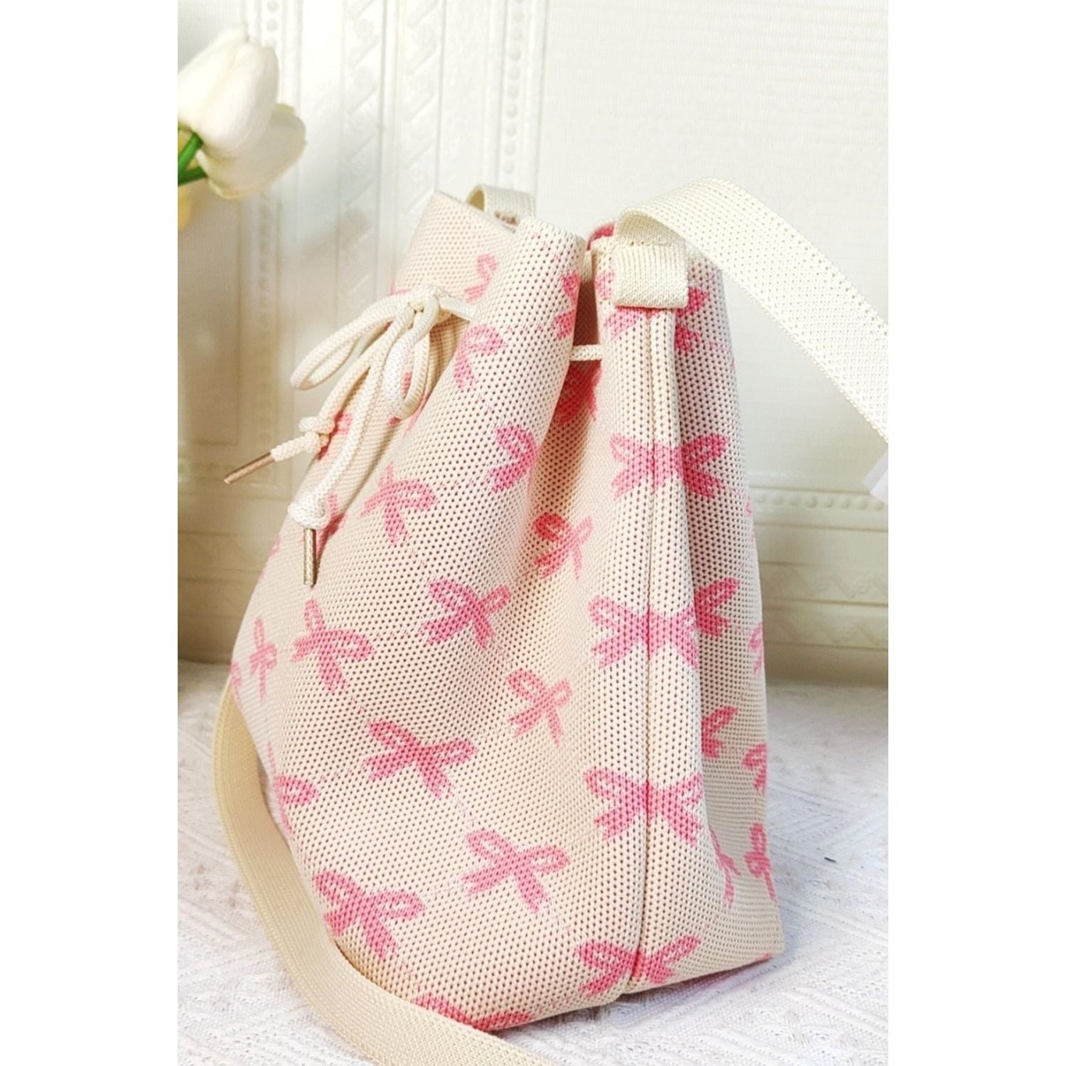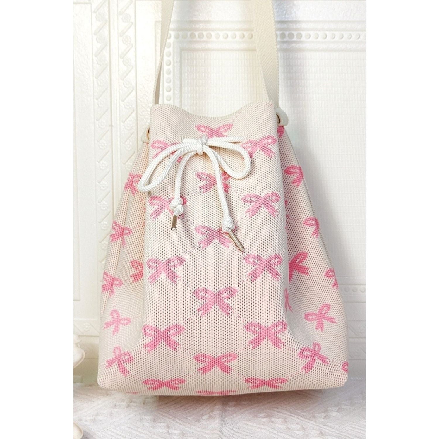The Ribbon Bowknot Pattern Crossbody Bucket is a charming and stylish accessory that features a unique design with a feminine touch. The ribbon bowknot pattern adds a playful and chic element to the bucket bag, making it a standout piece for your ensemble. With its crossbody style, this bag offers convenience and hands-free wear, ideal for busy days on the go. The bucket shape provides ample space to carry your essentials in an organized manner. Whether you're exploring the city or meeting friends for coffee, this crossbody bag is a versatile and eye-catching choice. Elevate your look with the whimsical appeal of the Ribbon Bowknot Pattern Crossbody Bucket, a fashion-forward accessory that adds a touch of fun to your outfit.