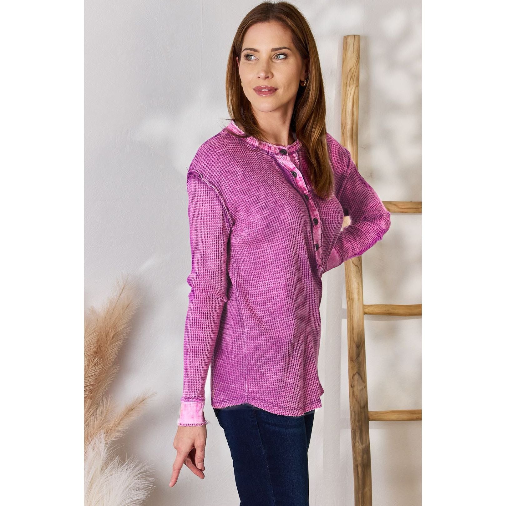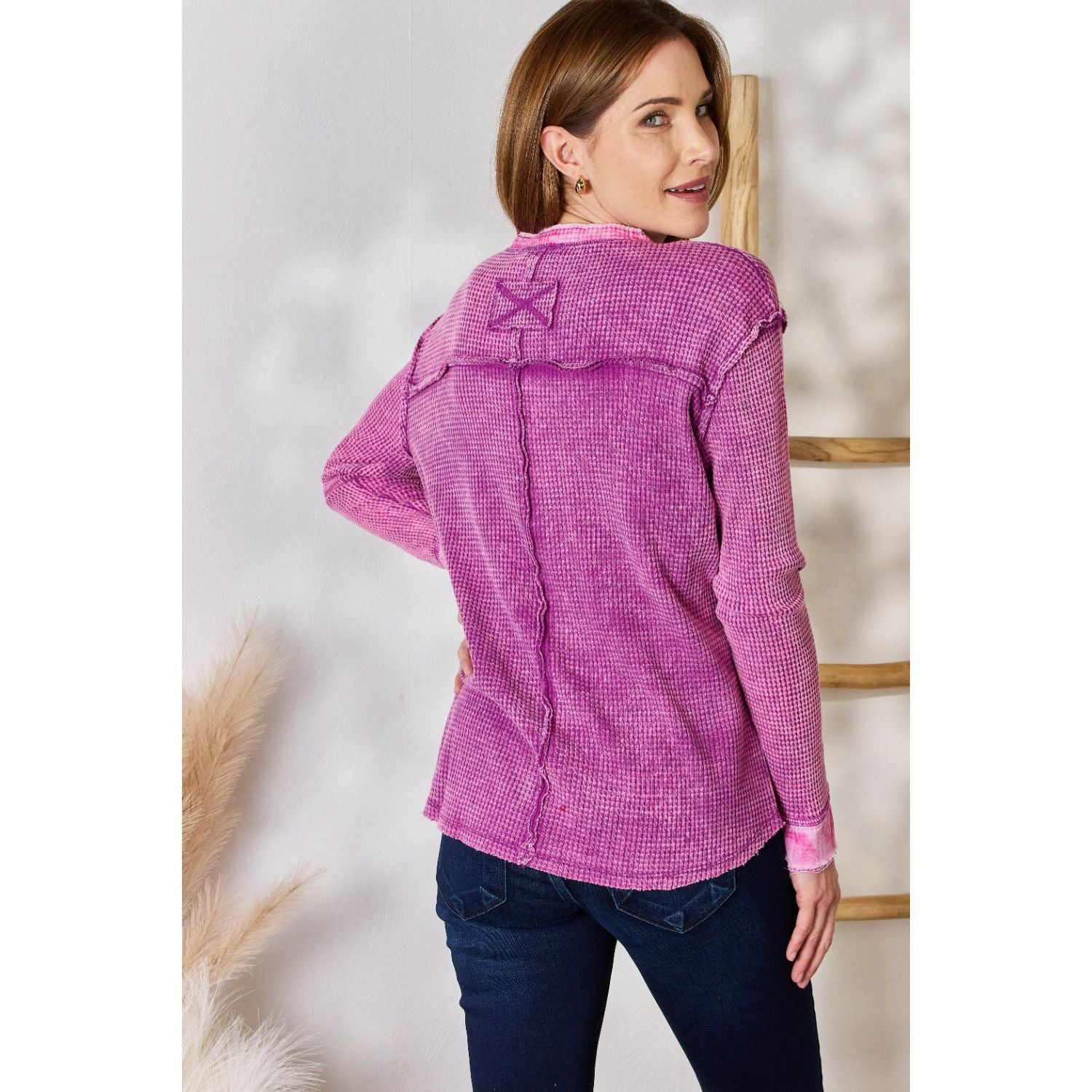 Zenana Washed Half Button Exposed Seam Waffle Top