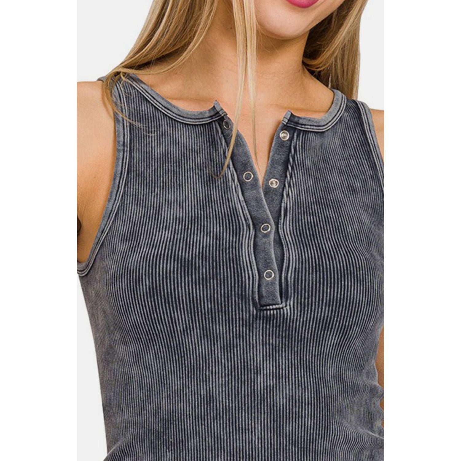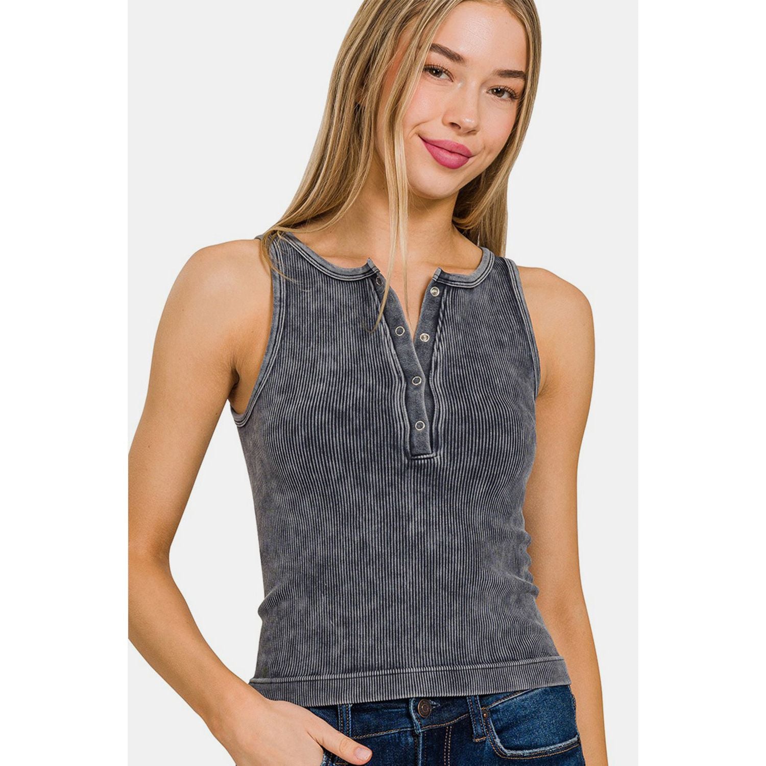 Zenana Washed Ribbed Half Snap Seamless Tank